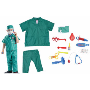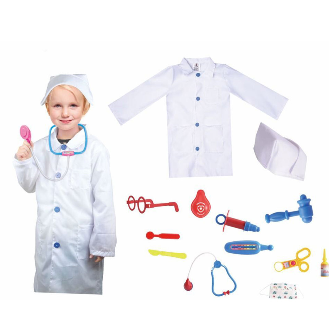 Veličina kostima odgovara većini dece uzrasta od 3 do 7 godina.Gonji deo je sirine 45cm,duzina 70cm. Sadrzi mantil i neophodan pribor za medicinsku pomoc.