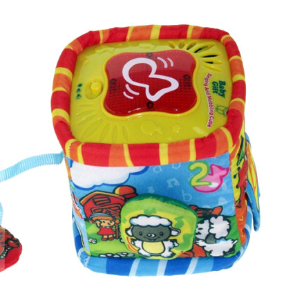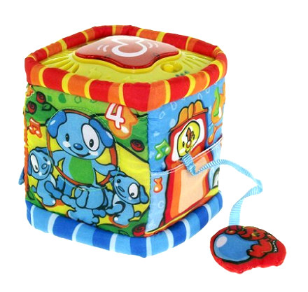 - Igračka ima i svetleće efekte – pritiskom velikog crvenog dugmeta, kocka svetli, rotira se i čuje se zanimljiva melodija