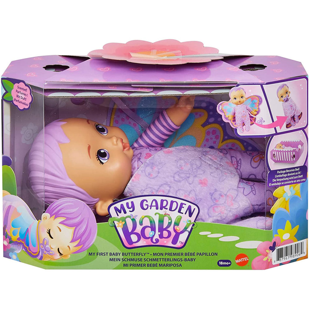 Set sadrži: lutku sa platnenim krilima, duda u obliku leptira, kao i krevetac koji se sklapa od pakovanja. MY GARDEN BABY lutka nudi klasičnu igru lutki za bebe na fantastičan način! Rođena sa mekim krilima i slatkim mirisom jasmina – ova beba leptir je spremna da se brinete o njoj. Umirite MY GARDEN BABY pomoću glodalice dude u obliku leptira i spremite je za spavanje tako što ćete sklopiti njena krila kao udobno ćebe za spavanje. Kutija za pakovanje se sklapa u krevetac gde MY GARDEN BABY može lepršati u slatke snove!