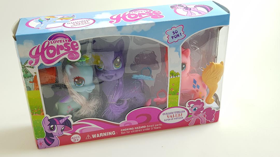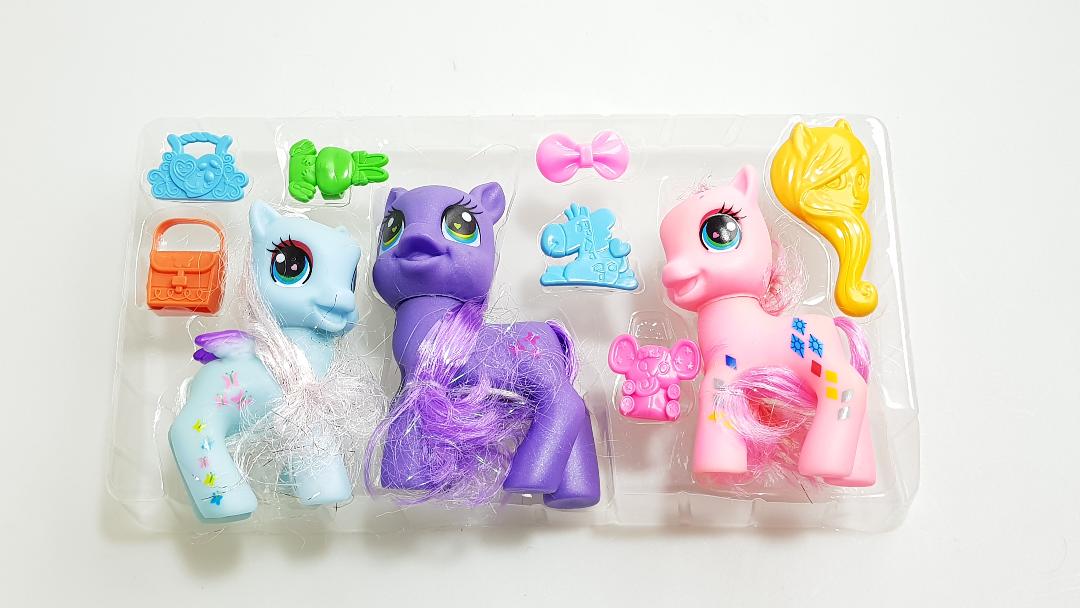 My Little Pony set sadrzi tri ponija plus dodatke za ulepsavanje: cesalj, snalice, prstencice.